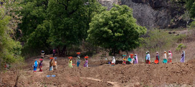 Cestou vidím těžení hlíny z malé vypuštěné přehrady, která byla asi už zanesená. Nečekejte žádné bagry a náklaďáky. Nečekejte ani chlapy s kolečkama jak vozí hlínu. Nakopaná hlína se transportuje pomocí živého dopravníkového pásu, který tvoří ženy. Nakopanou hlínu jim naloží do škopku, žena v pestrobarevném sárí si pak škopek šoupne na kroužek na hlavě a nese jej na hromadu. Funguje to jako v mraveništi. Jeden proud tam, druhý ven. Na hrubé práce jsou v Indii používány často. Stejně jsem viděl nosit na stavbách cihly, vodu, písek.... prostě na co si vzpomenete.