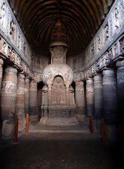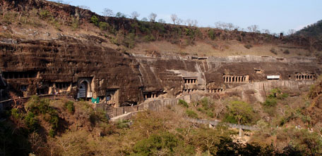 Ajanta je soubor jak jinak než posvátných, ručně tesaných jeskynní v zákrutě skalního masivu.Vždy je jen více či méně upravené průčelí a uvnitř jsou místy opravdu veliké sály, kde to vypadá jako v jiných chrámech. Sloupy, postavy božstev a různé symboly. Slunce už je nízko a vrhá na skály krásně měkké světlo, což je krásně vykresluje.